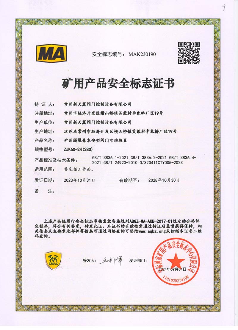 礦用隔爆ZB10-24中國國家強制性產品認證證書110.1